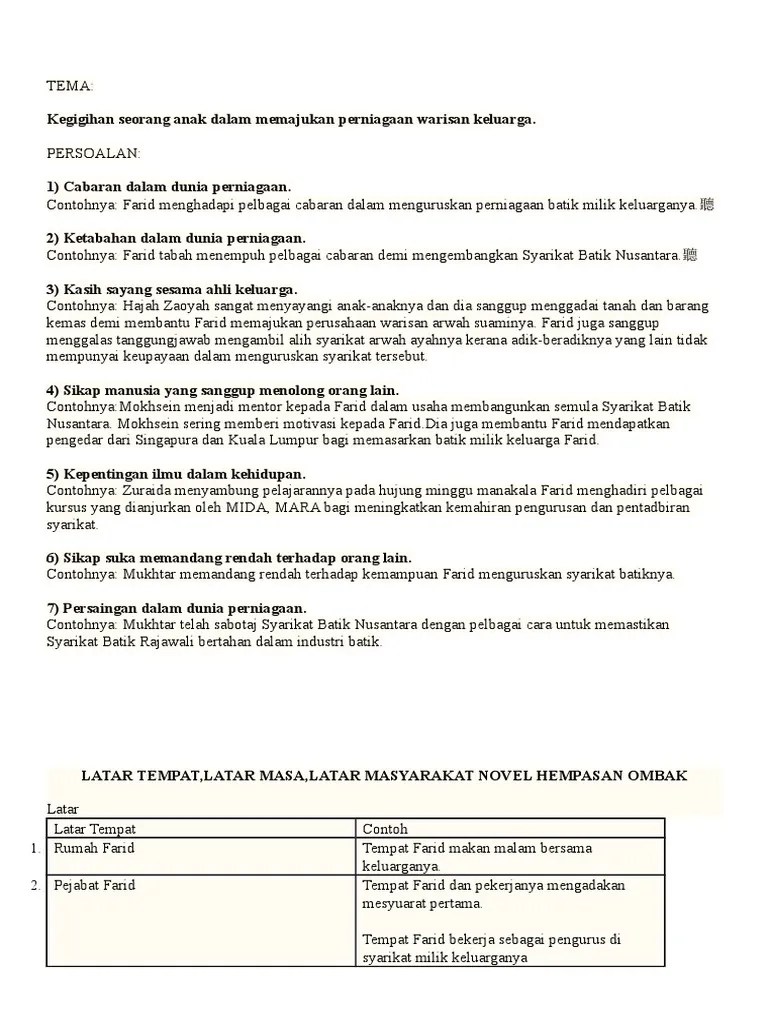 Baca versi flipbook dari hempasan . Haji badrul yang merupakan pemilik sebuah perniagaan batik bernama syarikat batik nusantara telah meninggal dunia. Sinopsis mengikut bab novel hempasan ombak. Baca versi flipbook dari sinopsis . Sinopsis bab 13, 14 (novel tingkatan 3) sinopsis bab 13 jam 2 pagi, keluarga hajah zaoyah terjaga kerana berlaku . 5 sastera 1, farid sahaja yang menjadi pengarah syarikat. Sinopsis bab 7, 8, 9 (novel tingkatan 3) bab 7: Farid terpaku di hadapan bengkel hingga azan subuh berkumandang. Farid kerap ingat akan pesan arwah bapanya . Sinopsis bab 1, 2, 3 (novel tingkatan 3) bab 1: Sinopsis bab 1, 2, 3 (novel tingkatan 3). Sinopsis bab 1 kematian ayahnya haji badrul telah melemahkan. Sinopsis, tema, persoalan, nilai, pengajaran ….